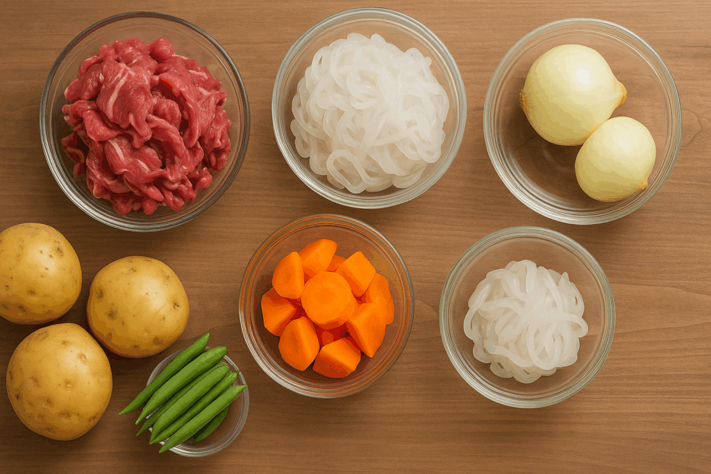 基本の食材は、牛肉・じゃがいも・玉ねぎ・にんじん・糸こんにゃくと、家庭でよく使われるものばかりです。